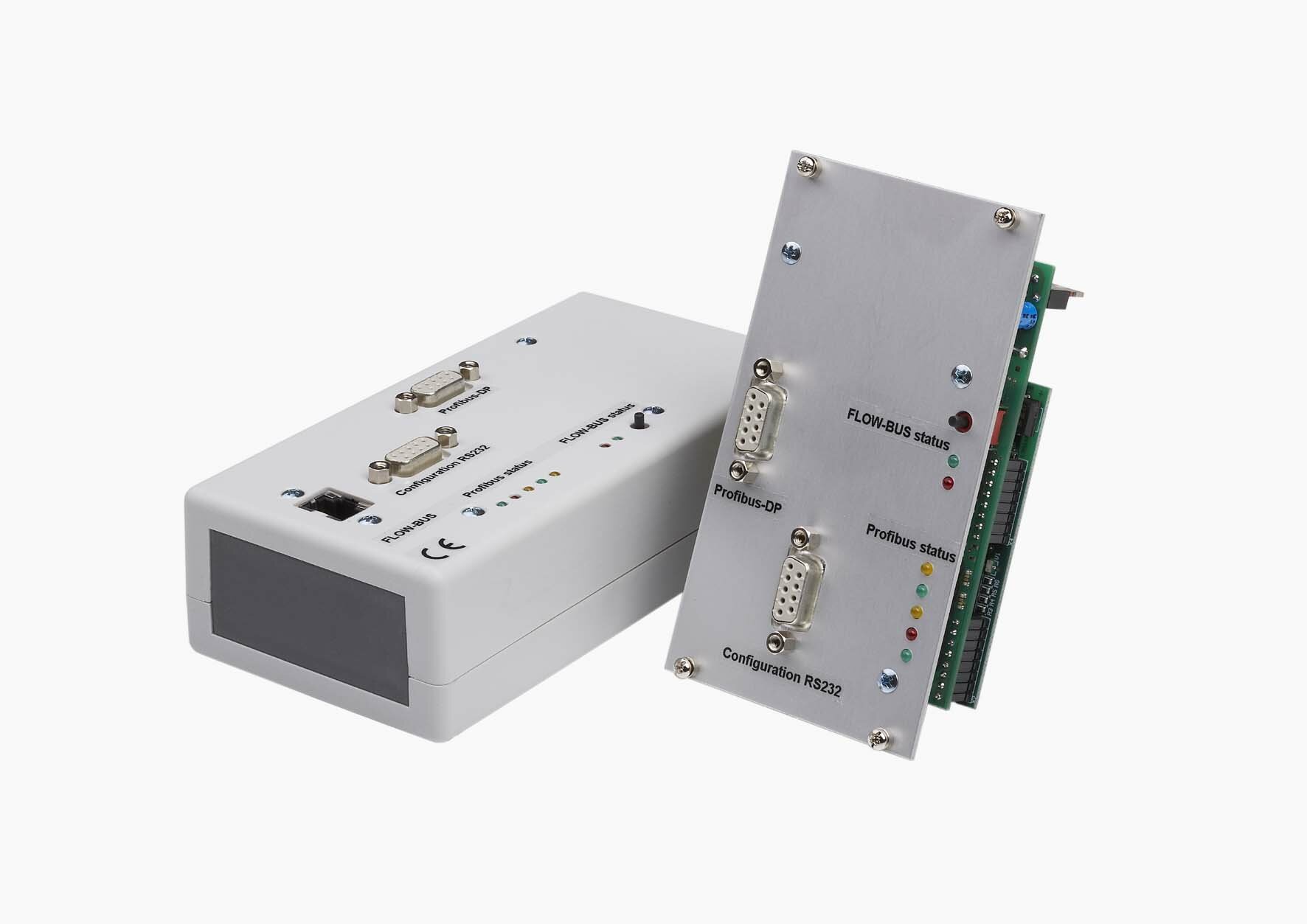 Bei Anwendungen welche eine PC Anbindung mit FLOW-BUS Feldbus-Systemen erfordern bietet Bronkhorst High-Tech E-7000 Module mit RS232 / FLOW-BUS Schnittstelle. Diese Module sind ebenso als separate Schnittstellenbox erhältlich (s. Bild).